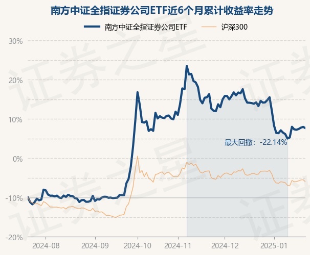 本站消息,1月22日,南方中证全指证券公司ETF最新单位净值为1.0839元,累计净值为1.0839元,较前一交易日下跌0.46%。历史数据显示该基金近1个月下跌8.84%,近3个月下跌4.29%,近6个月上涨35.34%,近1年上涨31.75%。该基金近6个月的累计收益率走势如下图: